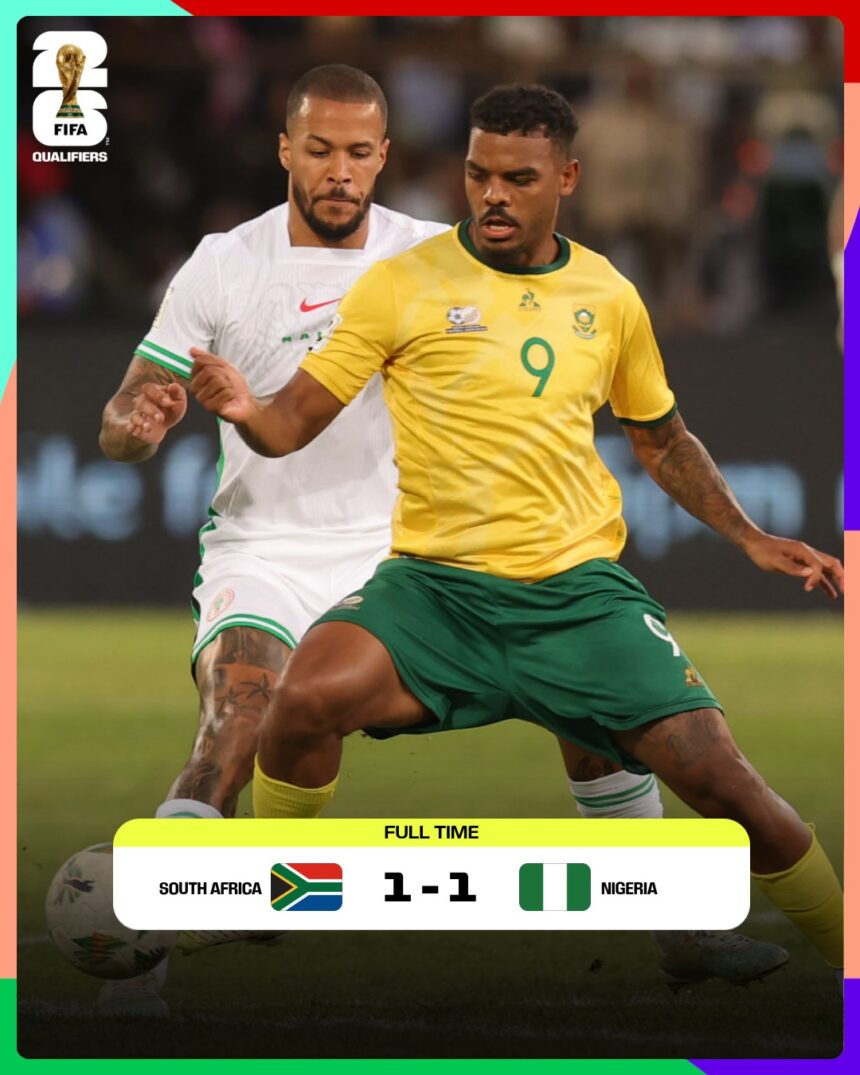 Nigeria’s Super Eagles’ hopes for qualifying for the 2026 FIFA World Cup have been reduced after a frustrating 1-1 draw against hosts South Africa on Tuesday, September 9, 2025.